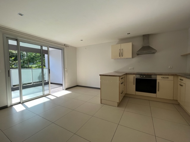 une entrée, une cuisine aménagée sur séjour et terrasse couverte,