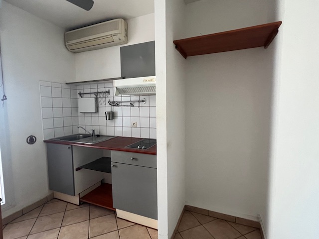 Pièce principale climatisée, avec coin cuisine et îlot central.