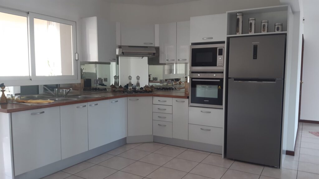 • une cuisine US équipée donnant sur une petite terrasse avec buanderie